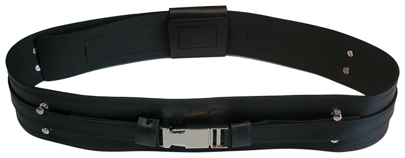 The centre belt is held securely in place with four pairs of rivets, a metal buckle and has been permanently stitched to the base belt at each end.